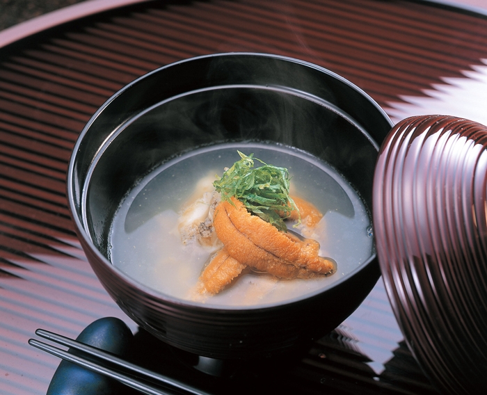 △제주도의 자매도시인 아오모리현(青森県)도 성게를 이용한 향토음식으로 알려져 있는 곳입니다. 하치노헤시(八戸市)와 그 주변의 산리쿠(三陸)해안 연안부에 전해지는 성게와 전복으로 국물 맛을 낸 ‘이치고니(いちご煮)’입니다. 원래 어부들이 바닷가에서 호쾌하게 익혀서 만드는 일상적인 가정 요리였지만, 시대의 흐름에 따라 성게와 전복이 고급 식재료로 취급되면서, 현대에는 결혼식이나 설날과 같은 경사스러운 날에는 빼놓을 수 없는 음식으로 소중하게 계승되고 있다고 합니다. 또한 ‘이치고니’라고 불리는 것은 이치고(딸기)를 재료로 사용하고 있기 때문이 아니라, 식기에 담았을 때, 전복 등의 엑기스로 인한 유백색의 탁한 국물 안에 올려져 있는 황금색 성게가 마치 아침 이슬을 머금은 산딸기처럼 보였다고 해서 붙여졌다고 합니다.